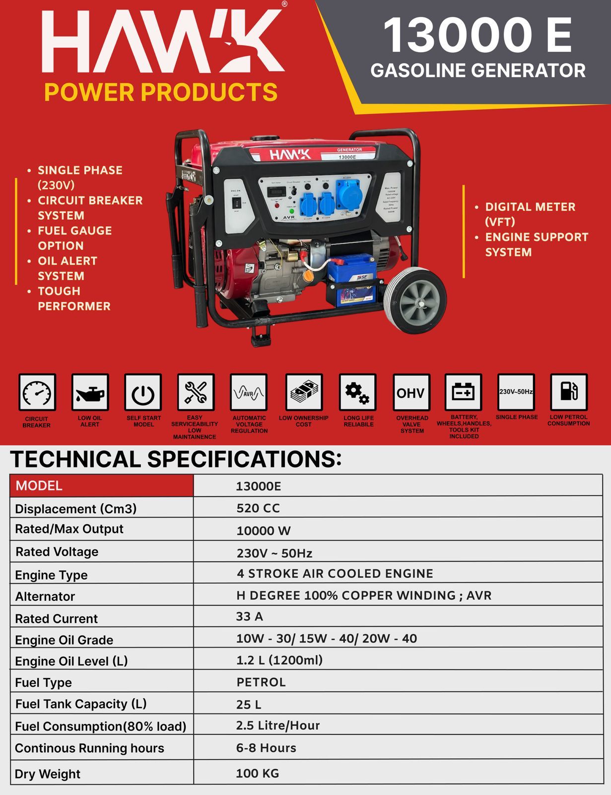 - Introducing the Heavy Duty Self Start 10kva Petrol Generator, delivering 1000 watts of reliable power whenever and wherever you need it. Engineered for durability and performance, this generator is your trusted companion for powering through any situation. With its robust construction and easy self-start feature, you can rely on it to provide consistent power for your home, business, or outdoor events.Experience peace of mind knowing you have a reliable power source at your fingertips. Whether you’re facing a power outage, running essential appliances, or tackling heavy-duty tasks on the job site, our 10kva Petrol Generator has you covered. Its efficient design ensures optimal fuel consumption, saving you money while reducing environmental impact.